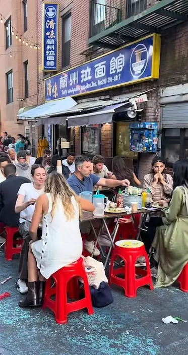 視頻中,老外坐在塑膠凳上就餐,有說有笑,還有很多人在排隊等待取餐。內地極目新聞聯繫到視頻發布者「芬妹」,她介紹道:「紐約有很多間蘭州拉麵館,生意普遍都很好,價格在當地也算比較合理,老外現在就餐都要排隊。」