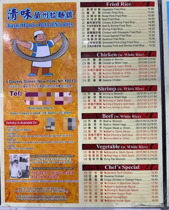 極目新聞注意到,在該麵館的菜單上,有中文和英文兩種語言,和大部分國外的中餐館一樣,都有部分改良過的菜品,如左宗棠雞、湖南雞等,價格大多在十幾美元上下。