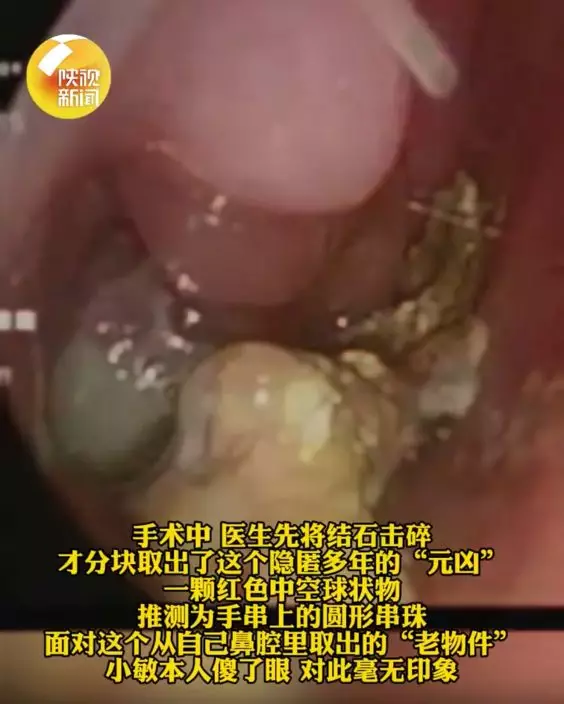 當日,醫生檢查時發現小敏鼻腔深處疑似存在異物,隨後安排電腦掃描(CT)檢查,結果清楚顯示鼻腔內有一個邊界清晰的球狀物體。由於異物滯留時間過長,已與周邊組織嚴重嵌頓,甚至形成堅硬的鈣化結石(鼻石)。手術過程中,醫生需先將結石擊碎,才能分塊取出「元兇」,最終取出一顆紅色中空的圓形串珠,推測來自手串或飾物配件。
