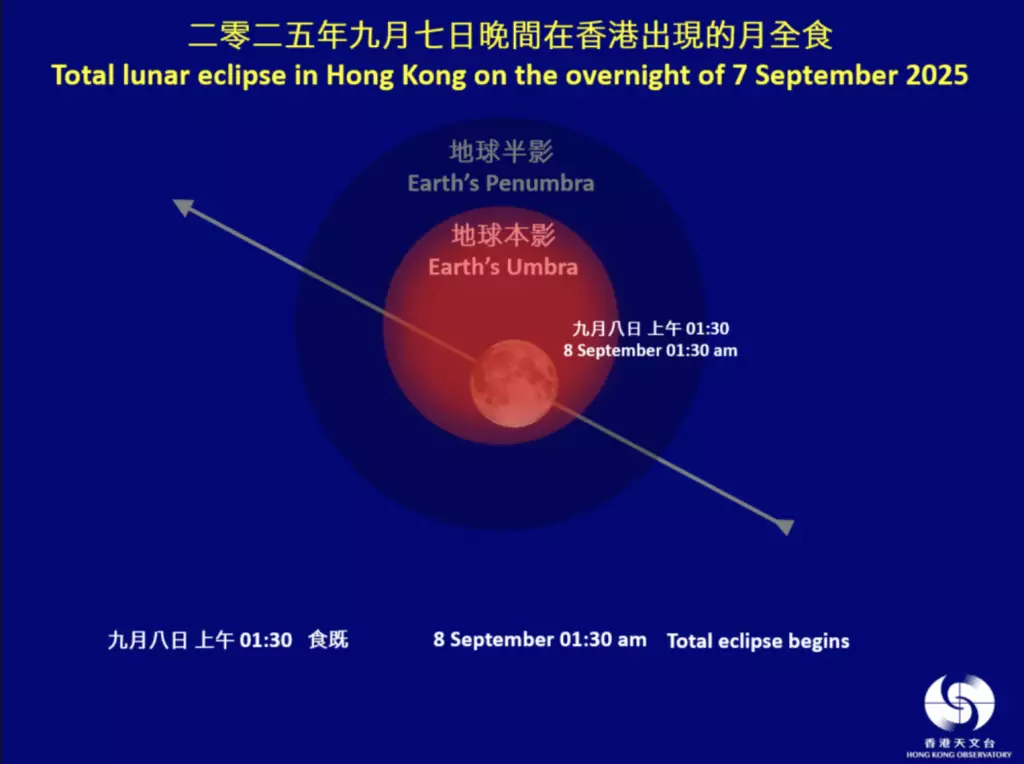 本港上空在下月7日深夜至翌日凌晨將出現月全食,市民可透過天文台、太空館、嗇色園主辦可觀自然教育中心暨天文館、保良局顏寶鈴書院,以及香港青年協會創意教育組的聯合網上直播網頁,觀賞月食過程。