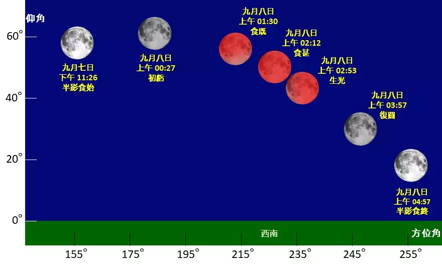 月食時間由下月7日晚上11時26分開始,翌日凌晨0時27分月球開始進入地球本影,凌晨1時30分月球完全進入地球本影,即月全食開始。食甚時間為凌晨2時12分,凌晨2時53分月球開始離開地球本影。