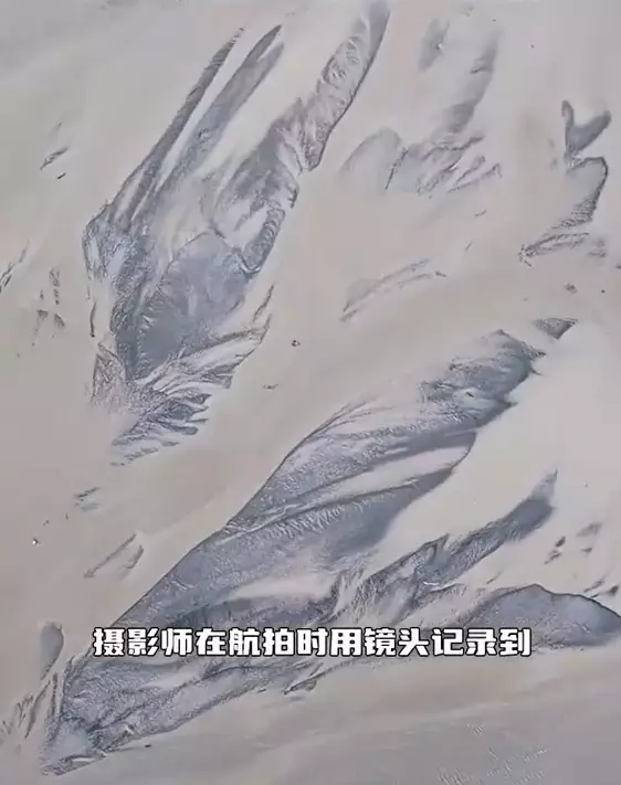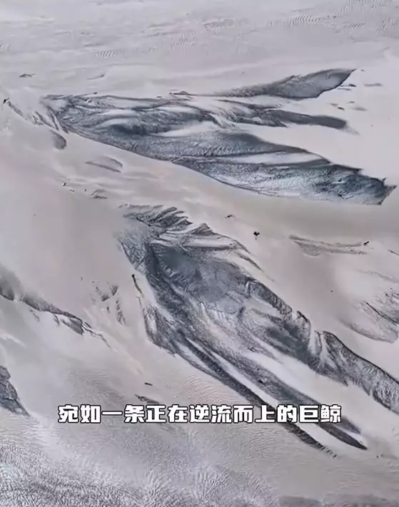 近日,新疆墨玉河英也爾段的河水逐漸退去後出現奇觀,河床上堆積的泥沙意外形成了壯觀的巨型「沙鯨」圖案。