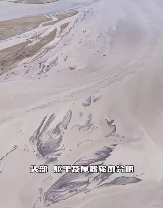 這幅壯觀的自然景觀從空中俯瞰可見,由於河水的減退,泥沙自然堆積成鯨魚的形狀,宛如一條巨大的鯨魚正逆流而上。鯨魚的頭部、軀幹以及尾鰭輪廓清晰分明,最寬處約240米,長度約達520米,震撼視覺效果令人印象深刻。