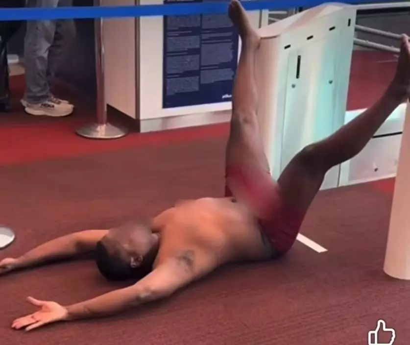 男子候機突脫去衣物擺古怪瑜伽姿勢遭警方帶離。Ig圖@thecrewroom