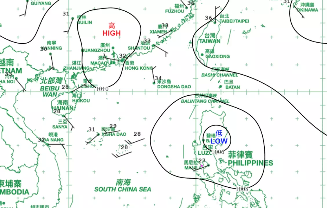 天文台表示,位於呂宋的低壓區將進入南海並增強為熱帶氣旋,預料會在晚上進入本港800公里範圍,屆時會發出一號戒備信號。