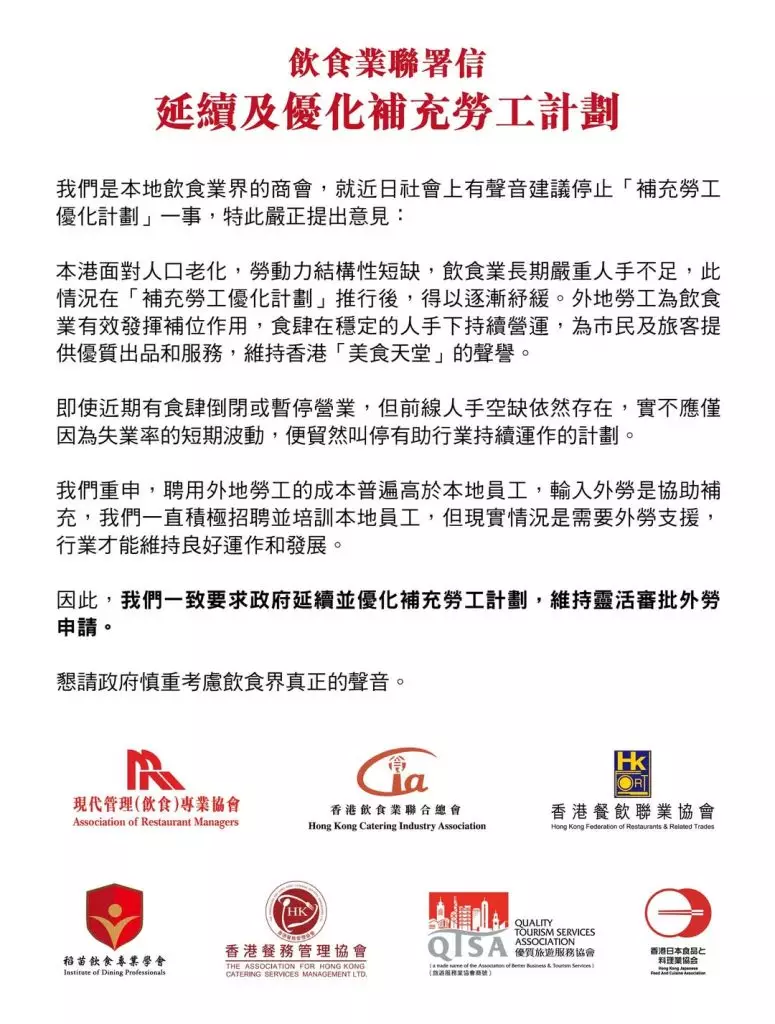 香港餐飲聯業協會在社交平台撰文指,協會一直關注行業人手問題,亦明白社會各界有多元聲音。業界正面對結構性人手短缺,一直努力優先招聘及培訓本地員工,期望政府能平衡各方需要,為業界及勞工制定合適政策,協助行業穩健發展,服務市民。