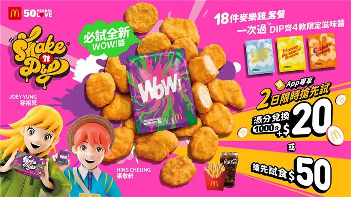 突發!兩位人氣巨星容祖兒、張敬軒再度合體帶來Shake & Dip滋味,以慶祝香港麥當勞50週年!睽違五年,兩位人氣巨星再度擔任Shake & Dip星級代言人,更合唱全新歌曲《Just For Fun》,於廣告中化身動畫人物穿越時空。精彩歌曲於今晚12時起上架,但各位粉絲現在可以率先觀看動畫廣告及精彩幕後花絮片。麥當勞App會員可於8月23日至24日(今個星期六及日)專享限時搶先試食優惠:只需以$20加1000分或$38加500分,或$50即可歎18件麥樂雞套餐,當中包括全球首度登場的「WOW!醬」,以及3款期間限定滋味醬--「蒜辣蛋黃醬」、「蜜糖芥末醬」和「香草檸檬醬」,約定大家前來挑戰試新醬。