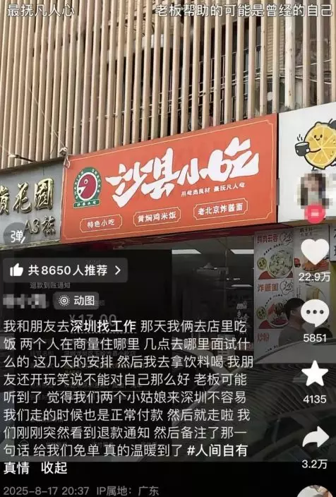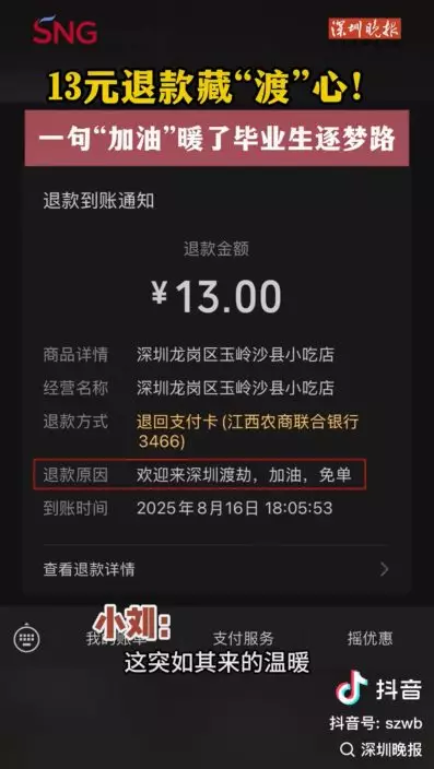 起初,2人誤以為系統出錯,細看發現竟是小吃店主動退回,備註欄上還寫著「加油,免單」等字眼,令她們感動不已。她們表示,「我們當時最真實的感受是淚流滿面,出門在外也是第一次可以感受到這種溫暖的時刻。希望他生意興隆,他會越來越好,我們都會越來越好」,同時將暖心經歷上載至社交平台,引來大批網民點讚稱「太暖心」。