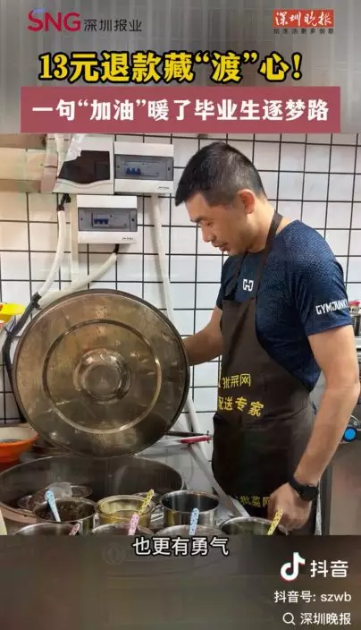 內地2名畢業生小吃店邊用餐邊談求職一事,沒想到離店後突收店主13元(人民幣)退款兼留言打氣感暖心。