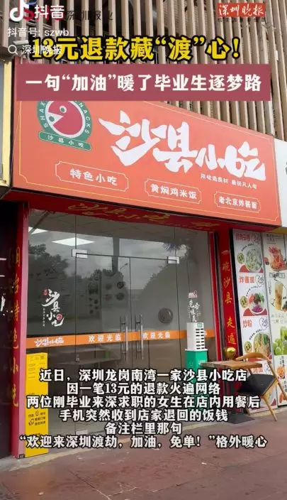 綜合內媒報導,內地兩名剛畢業到深圳求職的女生小劉與小宋日前於龍崗一間沙縣小吃店邊吃邊商量實習與求職事宜,用餐結束後邊離開。豈料,2人於當日傍晚6時左右突然收到商戶主動退款13元(人民幣,約14港元)。