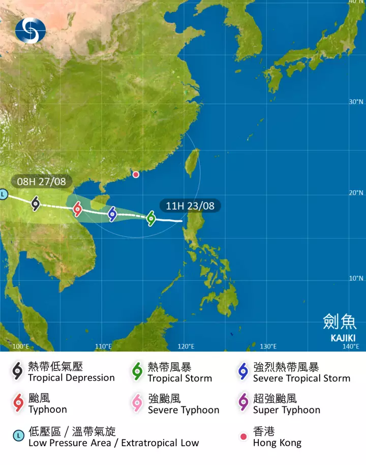1號戒備信號,現正生效。位於南海中部的熱帶低氣壓已增強為熱帶風暴,並命名為「劍魚」。