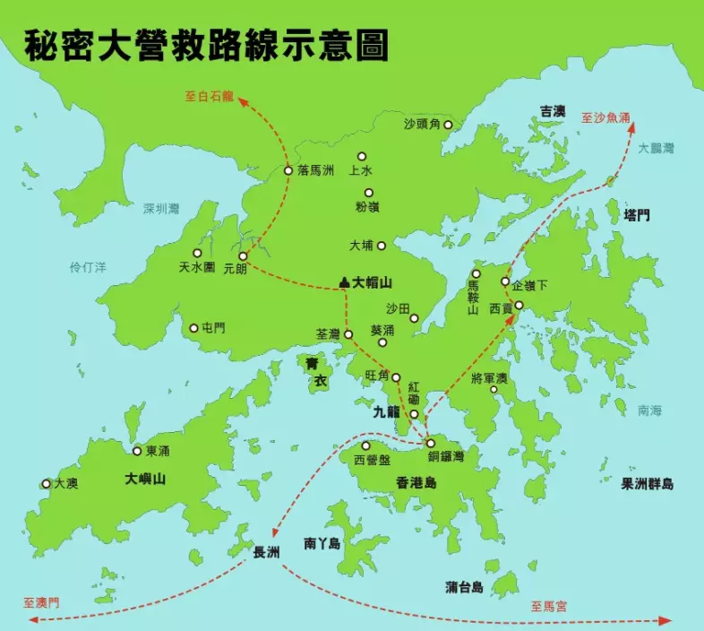 路線方面,從九龍撤離到東江游擊區,主要有東西兩條路線:東線由九龍經牛池灣到西貢,在企嶺下乘船渡過大鵬灣到惠陽游擊區,這條路線在香港淪陷前已經是廣東人民抗日游擊隊十分重要的海上運輸線;西線從九龍經荃灣翻越大帽山到元朗,渡深圳河抵達寶安游擊區據點白石龍村,這是當時香港難民返回內地的主要線路。