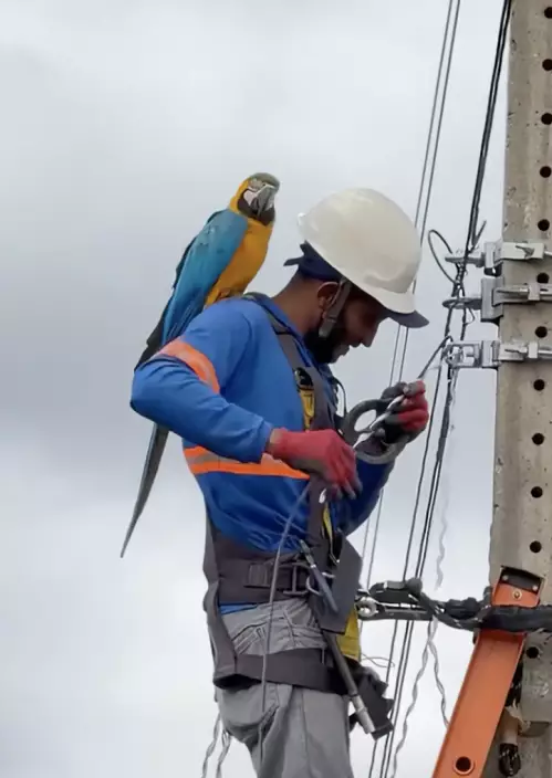 巴西技術員電線桿上高空作業被一隻「野生金剛鸚鵡」跳肩上嬉戲啄耳仔,有愛互動畫面曝光!