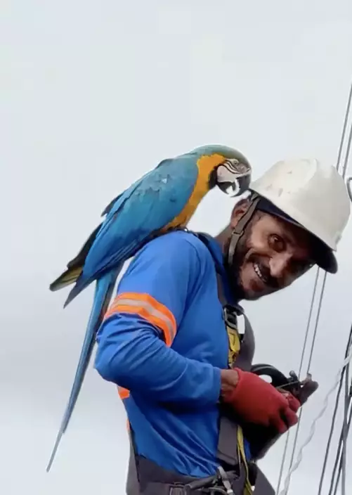 綜合外媒報導,巴西一名通訊技術員桑塔納(Andre Souza Santana)日前爬上電線桿作業時,偶遇一隻鮮豔的藍色「金剛鸚鵡」並與之展開有趣互動。當時,這隻鸚鵡不僅靠近觀察桑塔納,甚至還主動跳上他的肩膀,似乎覺得桑塔納身上的藍色制服與自己很「投緣」。