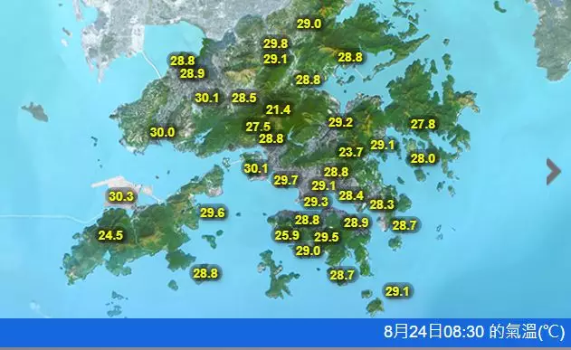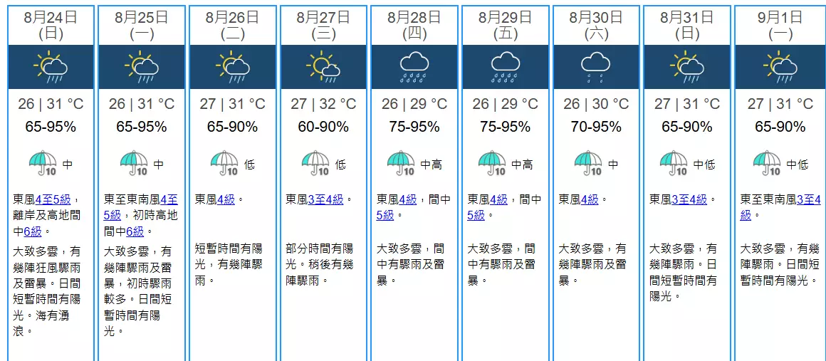 預料本港星期日 (8月24日)大致多雲,有幾陣狂風驟雨及雷暴。日間短暫時間有陽光。最高氣溫約31度。吹和緩至清勁偏東風,離岸及高地間中吹強風。海有湧浪。海有湧浪,天文台呼籲市民請遠離岸邊及停止水上活動。