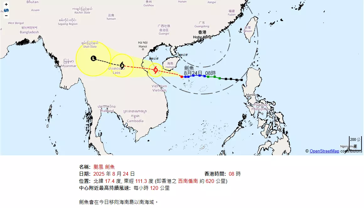 劍魚在過去數小時稍為增強,但繼續穩定地向偏西方向遠離香港。天文台網頁截圖