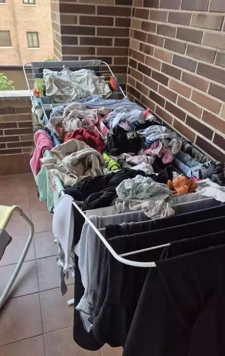 照片可見,一個白色晾衣架上堆滿各種潮濕衣物,包括襪子、內衣及童裝等,只有大件衣物是正常掛好,現場相當凌亂。