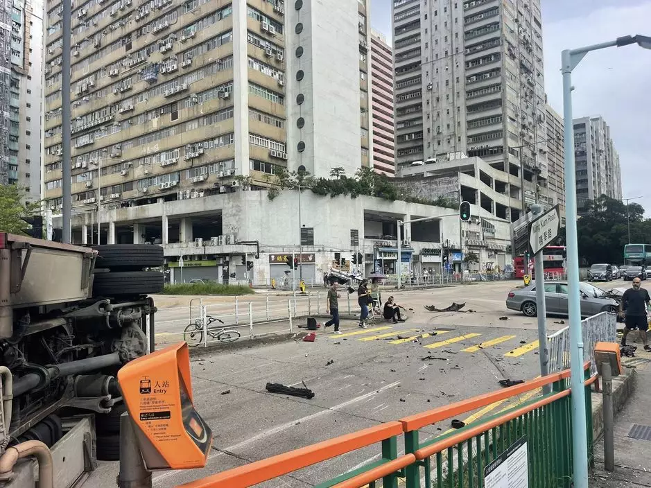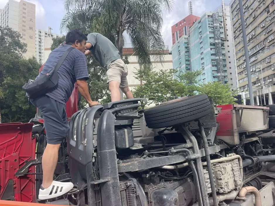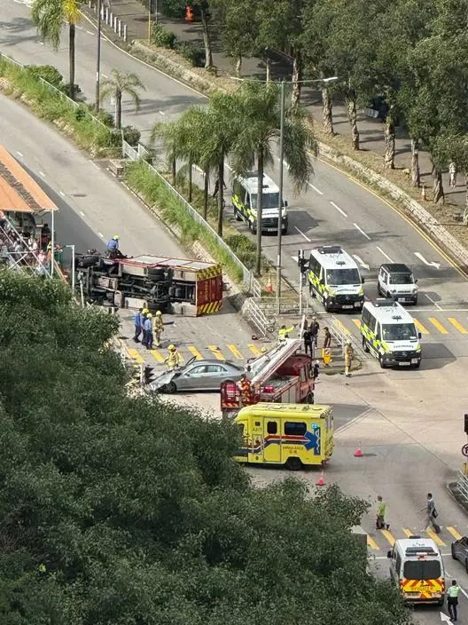 網上流出意外發生後的圖片,見到涉事的消防車翻側橫躺在路中心,有幾位熱心市民爬上消防車幫手救援,而私家車車頭嚴重受損,零件四散,警方正調查車禍原因。