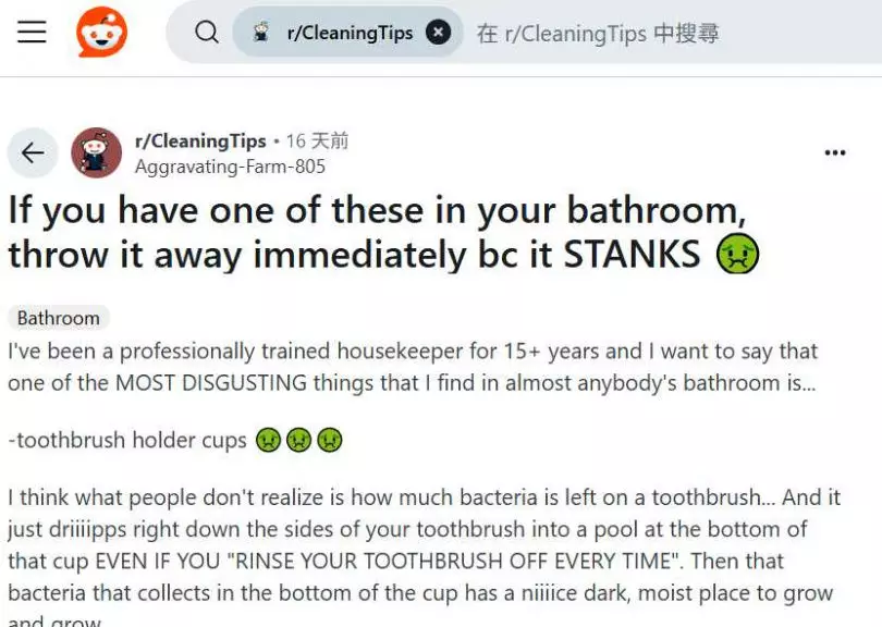 日前,國外一名擁有15年經驗的專業清潔師在論壇Reddit上發帖指出,「牙刷杯」幾乎是每個家庭浴室最污糟的物品,因為牙刷使用後依然殘留大量細菌和水分,而牙刷杯恰好提供了一個「陰暗、潮濕」的環境,讓細菌能夠大量繁殖存在健康隱患,並直言牙刷杯累積的意味曾讓她乾嘔。她強調:「我這輩子不會再用牙刷杯,唯一乾淨的方式是將牙刷懸掛,讓水分自然滴乾」。