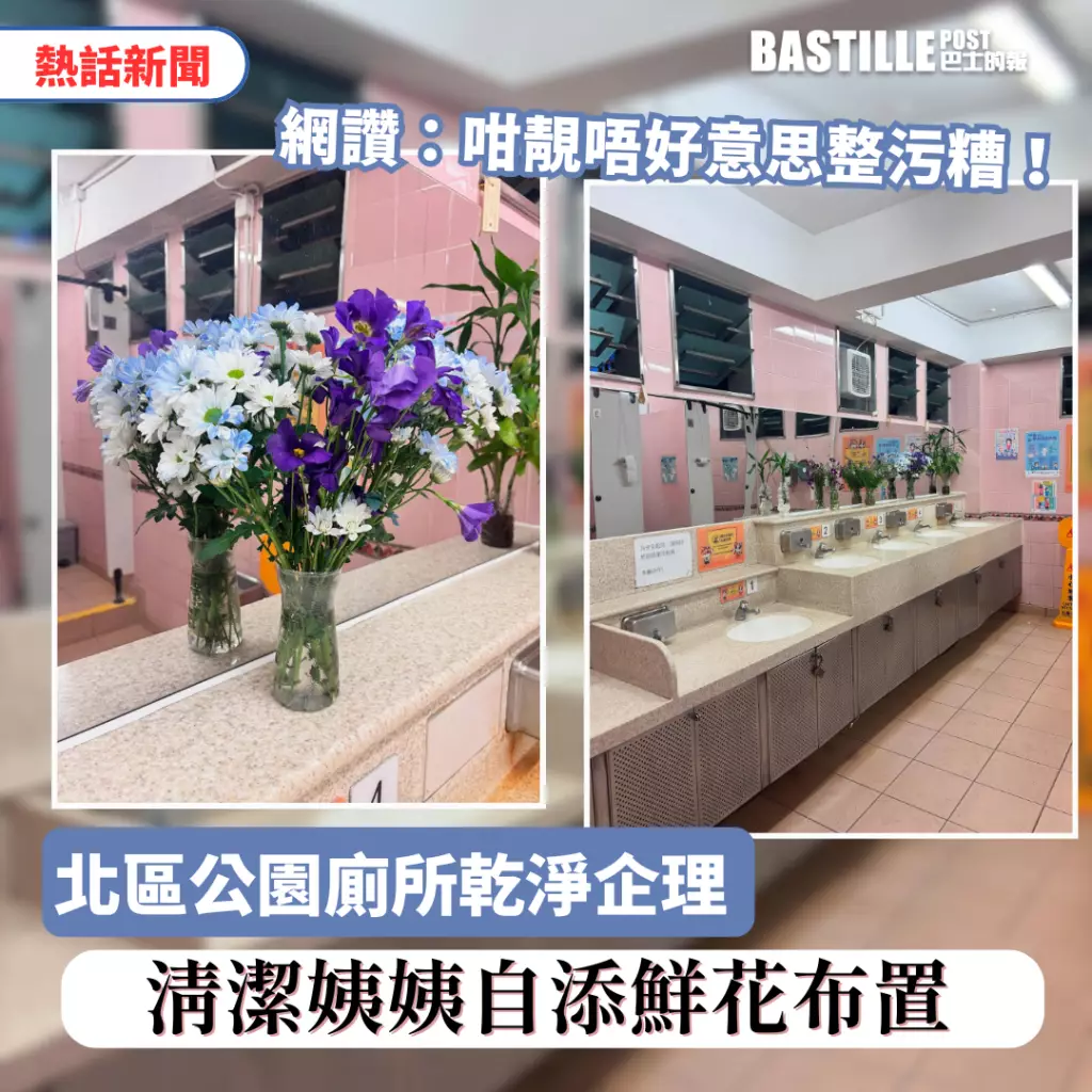 大家普遍都對香港的公廁印像不太好,總是覺得污糟兼有臭味,人有三急時如有得選擇,寧願去商場或借食肆廁所用。不過,近日有網民在社交平台分享,指北區公園公廁,不但環境靚又乾淨,且清潔姨姨還擺放了幾樽鮮花,更不時更換!