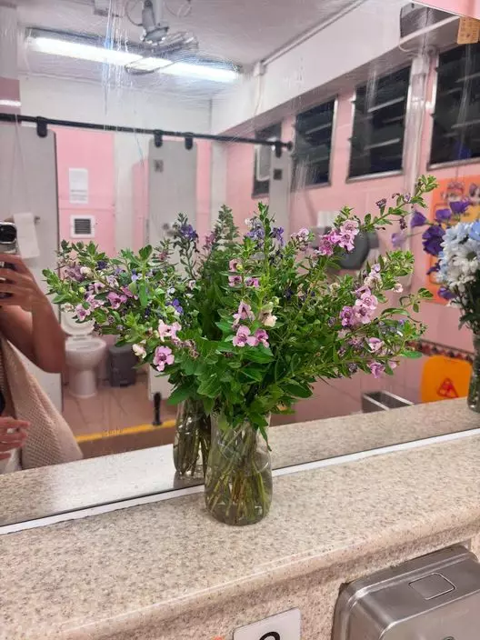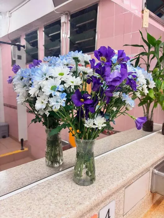 由網友在社交平台分享的照片所見,相中的公廁光線充足,四周乾淨企理,而洗手盆的上方則擺放了一列鮮花及植物,網友更為每瓶鮮花來個大特寫。在鮮花的點綴下,整個公廁的環境都顯得寧舍不同,令使用的人士都心情開朗!網友指清潔姨姨「定期會換新花」。大讚她好有心思,更「覺得要加佢人工」