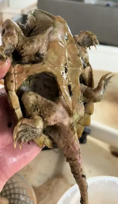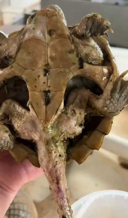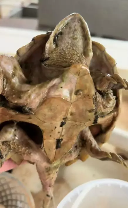 這隻鱷龜雖然奇蹟般存活了下來,但是已餓到身形枯瘦、四肢萎縮呈現「殼包骨」模樣。影片可見,這隻鱷龜的身體嚴重消瘦,與巨大的龜殼不成比例,四肢更是瘦骨嶙峋,幾乎僅剩一層皮緊貼著骨頭。若非牠能緩慢活動,幾乎會被誤認成一具「乾屍」。