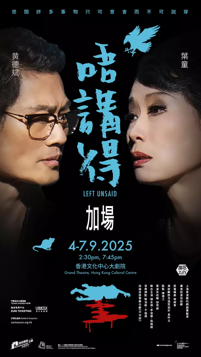 由葉童和黃德斌領銜主演,改編自上海話劇藝術中心原創舞台劇《不可說》的廣東話版黑色話劇:《唔講得》將於9月4 - 7日在香港文化中心大劇院重演,4 - 6日為夜場晚上7時45分場次,6日特別加開下午2時30分場次, 7日為日場下午2時30分場次,票價分別為$680、$480、$280 和$180 四種。觀眾反應熱烈,尚餘少量門票於進念購票平台及城市售票網公開發售。