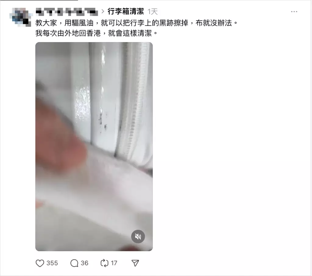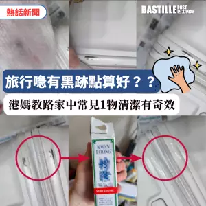 日前就有港媽在網上分享清潔行李箱污跡的神技 ,指利用家中常見的驅風油便能擦掉黑跡,該名港媽指,「上網睇到,本來我都唔信,但屋企有枝驅風油,就拎黎試下」。事主示範具體操作方法,首先將乾布沾上驅風油,再大力於污跡處來回擦拭,短短幾秒鐘時間,便可以輕鬆消除黑色痕跡。影片最後更展示了用來示範的白色行李箱清潔前後的對比,效果令人驚歎。不過該名港媽亦提醒網友,此方法對布料行李箱無效。