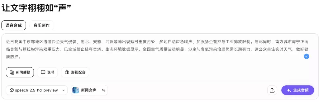 只要輸入文字,AI就可輸出語音。用戶可按喜好、需求,選擇相應的聲音、模式及語調。網頁截圖