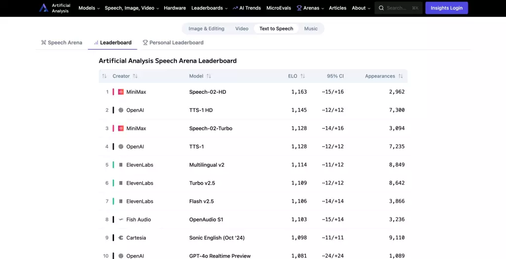 Speech-02的商用定價僅為全球頭部語音模型ElevenLabs的四分之一。Artificial Analysis 評測榜單截圖