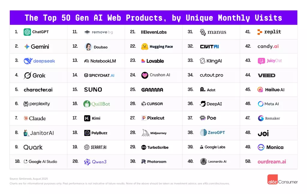 A16z的top 50 ai產品排行榜上,Minimax的hailuo AI 亦榜上有名。資料圖片