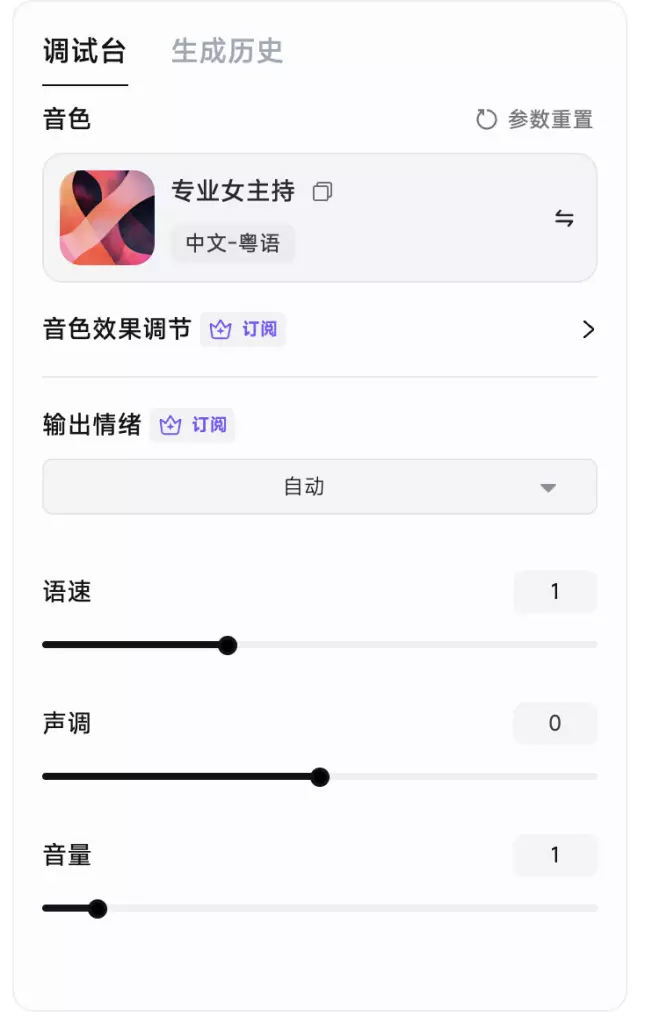 用戶更可調整輸出情緒、語速、聲調及音量。網頁截圖