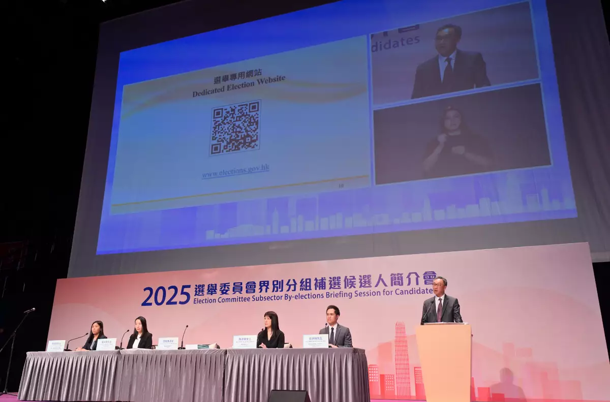 選舉管理委員會主席陸啟康在2025年選委會界別分組補選候選人簡介會,向候選人講解選舉安排、選舉活動指引內容及進行競選活動時應注意的重要事項。