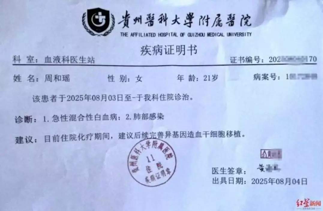 綜合內媒報導,貴州貴陽市烏當區一名21歲女大學生「周和瑤」現就讀揚州大學音樂學院,正值大四階段,準備應考研究生。2025年7月,她因持續高燒不退,被同學送院檢查後發現白血球指數異常,翌日返貴陽進一步診治,最終確診為「急性混合細胞白血病」,並檢出FLT3-ITD陽性等高危基因突變。院方指出,該類型白血病復發風險高且治療難度大,需盡快接受造血幹細胞移植。為協助她渡過難關,揚州大學音樂學院曾為她舉辦募捐音樂會。