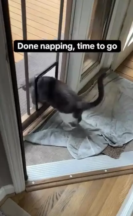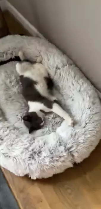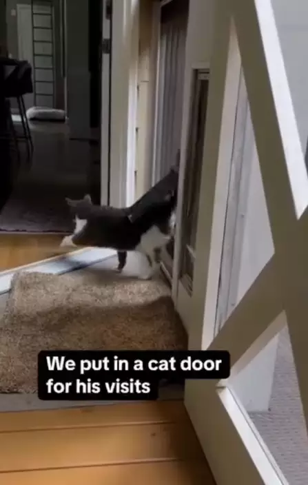 飼主表示,奧利佛幾乎天天跑來家中作客,由於來訪次數實在太頻密,於是乾脆安裝一扇專屬貓門,方便牠自由進出。影片可見,當兩隻狗狗趴在前院休息時,奧利佛便靈巧穿過貓門進入屋內,之後悠然自得躺在狗床上睡覺,看上去完全不像客人,更像是自家成員般。