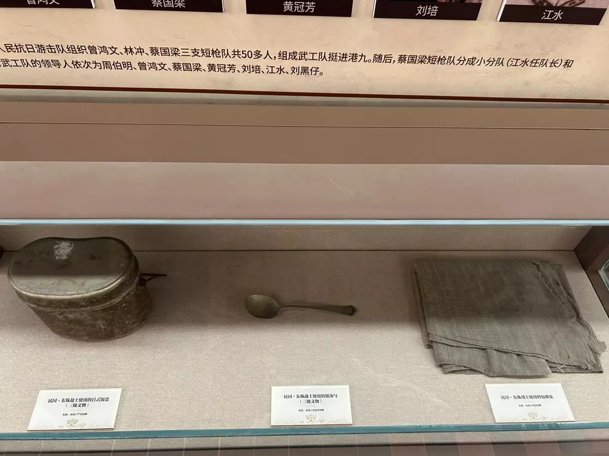司令部舊址展覽館內珍藏多件珍貴文物,包括東縱戰士翟信使用的銀湯勺、嚴英使用的日式飯盒及東縱幹部葉源的1957年三級解放勳章,均為大鵬新區博物館館藏三級文物,見證了東縱戰士的艱苦奮鬥與革命精神。
