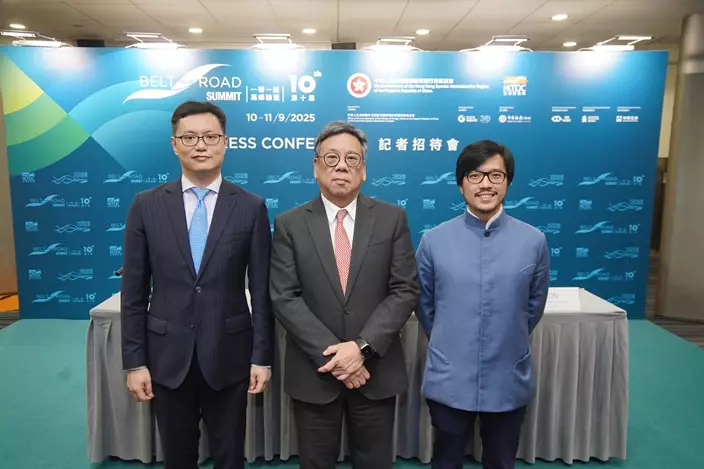 (左至右)香港貿易發展局副總裁劉會平、商務及經濟發展局局長丘應樺及「一帶一路」專員何力治分享「一帶一路」倡議的最新發展、過往九屆「一帶一路高峰論壇」的成果及介紹即將舉行的第十屆「一帶一路高峰論壇」。圖片來源:香港貿發局