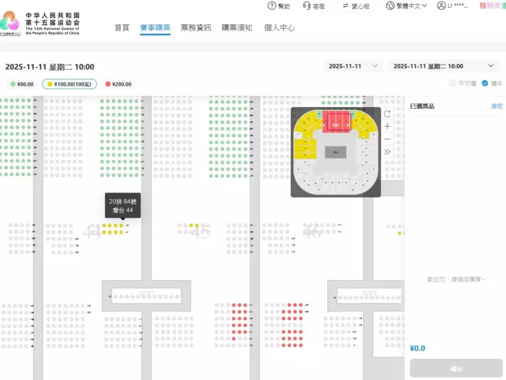 早上10時,在官方線上票務平台,十五運會官方票務網站上,記者登入早前已註冊的戶口,見到網頁有不同項目的售票選項,巿民可透過選擇不同賽區,再選擇想購買的門票。進入有關賽事項目後,可檢視有關賽事的時間表,再選擇購票的日子及座位及不同票價的門票。以香港賽區的男子22歲以下籃球賽為例,可以選擇不同票價的座位購票,過程大致暢順。