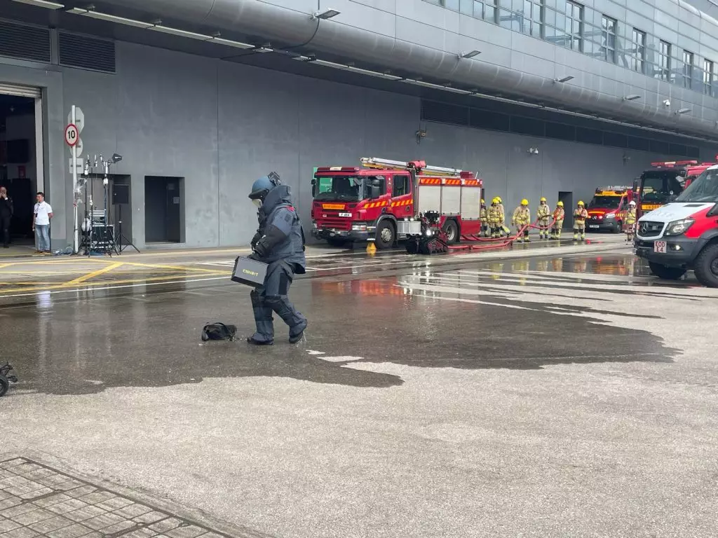 反恐演習按計劃順利推進,警方在現場地下發現一個可疑黑色背囊,懷疑裏面藏有爆炸品,機械人完成初步摧毀後,身穿全身式防護衣及佩戴護目鏡的「拆彈專家」炸彈處理主任到場支援,其身穿重達80多磅防爆衣在現場作出檢查,確保可疑物品已安全處理,再通知政府化驗所到現場進行檢驗及搜證。