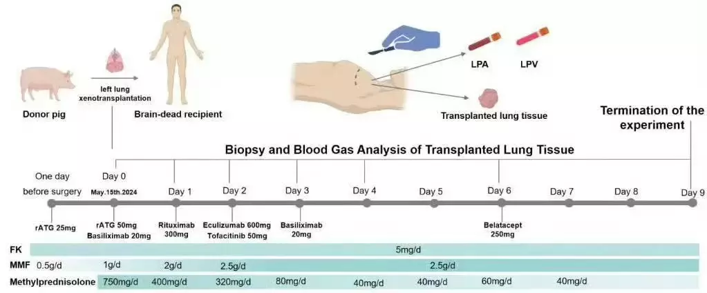 該項研究由廣州醫科大學附屬第一醫院何建行教授帶領的團隊開展。研究團隊將一隻經過6處基因編輯的巴馬香豬的左肺,移植至一名腦死亡受體體內,以此模擬臨床常見的單肺移植手術。