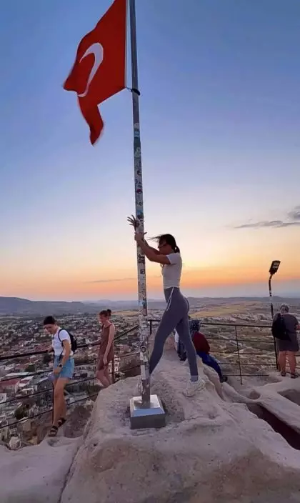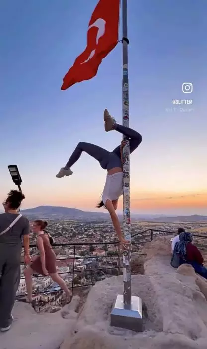 影片可見,瑪麗亞姆在土耳其中部觀光勝地卡帕多奇亞(Cappadocia)烏奇沙城堡(Uchisar Castle)附近,靠著升旗桿做出多個鋼管舞的高難度動作,現場吸引不少途人駐足圍觀。