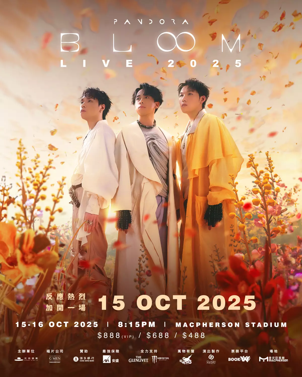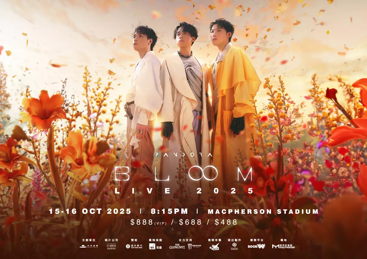 由主音兼結他手Tony、低音結他手Anakin阿勤及鼓手Michael細佬的獨立樂隊Pandora近年人氣高漲,由光尚娛樂主辦,10月16日於麥花臣場館舉辦的《BLOOM LIVE 2025》演唱會,門票開賣後短短一小時內全數售罄。由於反應空前熱烈,樂隊宣布加開10月15日一場,門票將於9月1日BOOKYAY公開發售。
