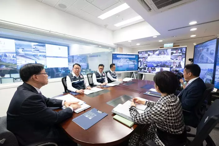李家超和政務司司長陳國基聽取保安局局長鄧炳強的現場匯報。李家超FB圖片