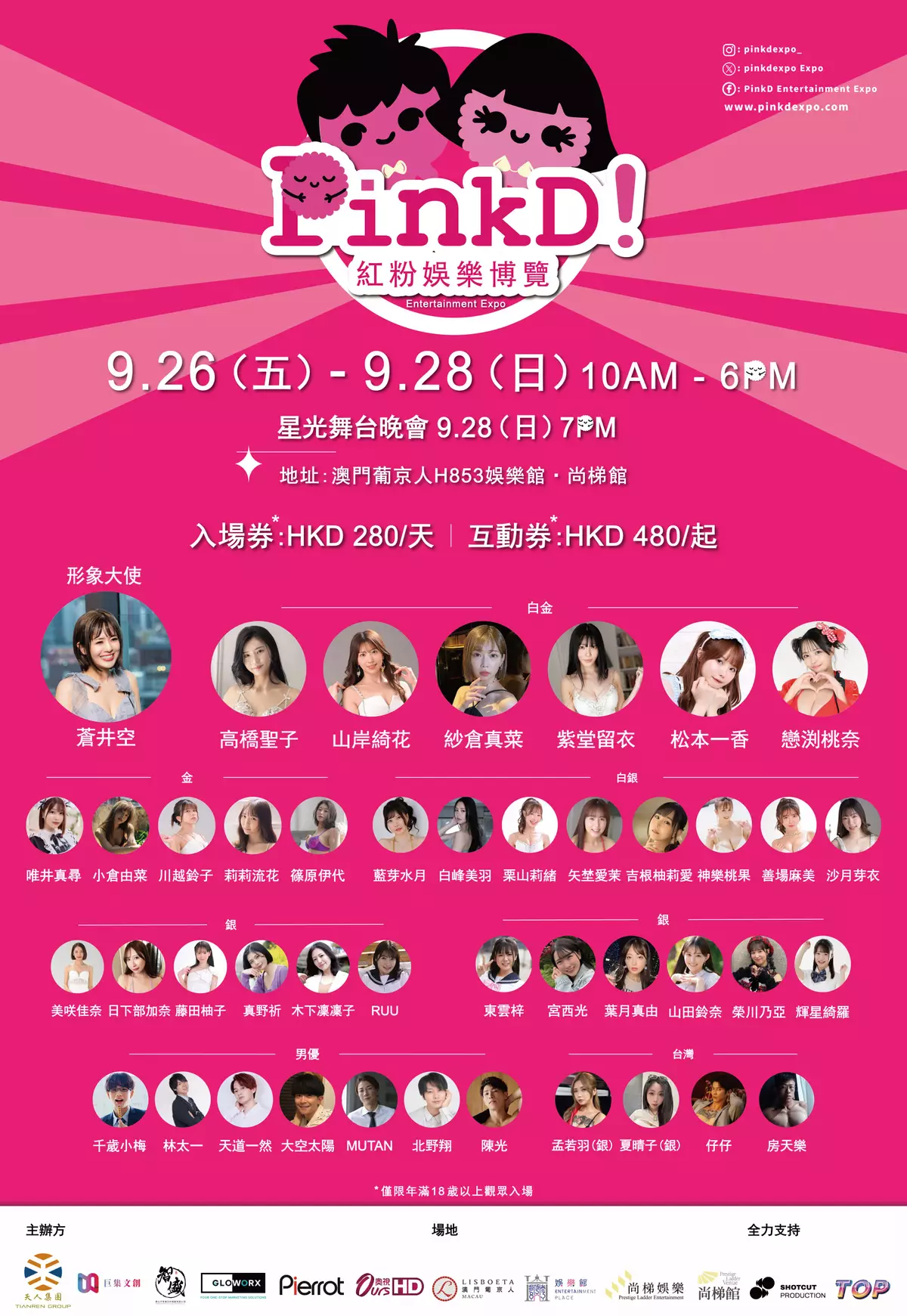 又帥又壯「同志天菜」陳光拍攝多部GV,是著名的同志天菜,目前X 超過有36萬追蹤,也跨足OnlyFans平台發展。「女性向四大天王」大空太陽是著名鹽系男友,清爽又時尚的外型,擁有比例超好的身材。「療癒系巨根奶狗」林太一活躍於成人影片行業,外表可愛奶狗型的林太一對自己巨大尺寸感到自豪,反差萌極大,透露拍攝對手已超過二千人。「犬系男優」北野翔長相帥氣,笑起來靦腆,擁有精壯六塊肌,反差感極大的他,被粉絲封為「狂野系天菜」,更是公認的耐久型代表。千歲小梅則以鄰家男孩的清新外型及「溫柔系男友」形象吸引眾多女性觀眾,被譽為女性向AV代言人。「純情系男友」天道一然以自然不做作演技馳名業界,更是一名貓奴,粉絲夢想中的男朋友。傳奇男優MUTAN 阪本隆太 (ムータン)(AV花美男) 與鈴木一徹和月野帶人並稱為「色情三劍客」。一開始便活躍於女性向的AV類型,並在2010年因「SILK LABO」推出的熱門AV系列「東京恋愛模様」而成功取得突破。《PinkD ! 紅粉娛樂博覽–澳門站》台灣攤位亦帶來台灣著名男優仔仔及房天樂,仔仔擁有「十七公分」凶器,出道逾5年、拍攝作品超過500部,業界公認的高產值男優之一,於2024年跨足挑戰同志成人片。「健身男孩」房天樂,靦腆又帥氣,但身兼健身教練的他擁有健壯身材,入行3年已有高達200多部作品。如此強勁陣容前所未見。