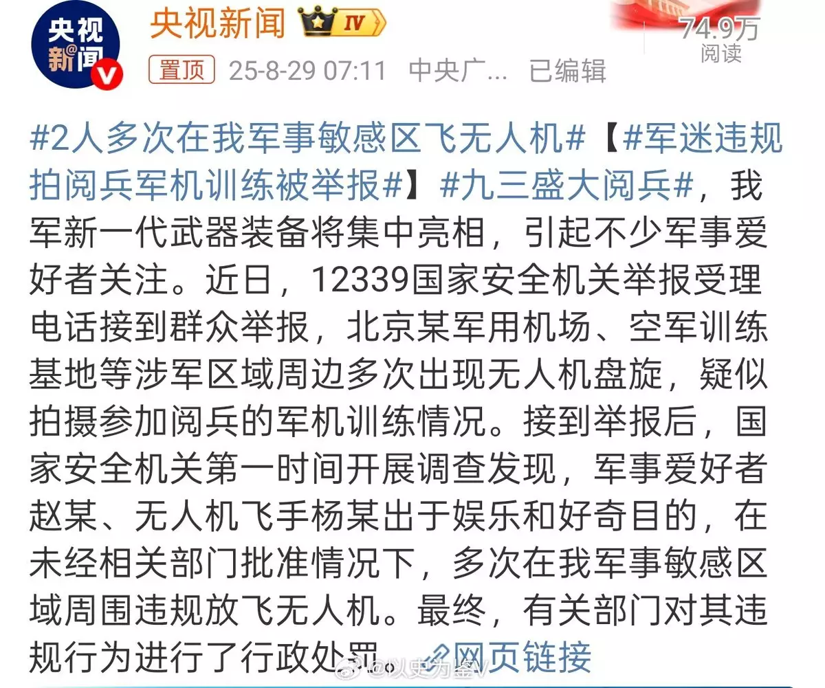 國家安全機關舉報受理電話近日接到舉報,指北京有軍用機場、空軍訓練基地等涉軍區域周邊多次出現無人機盤旋,疑似拍攝參加閱兵的軍機訓練情況。