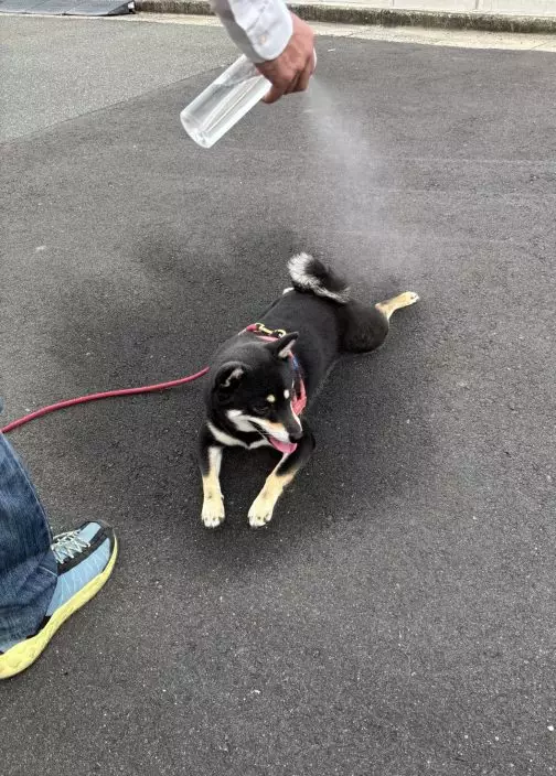 黑柴犬外出散步 飼主幫噴水消暑降溫