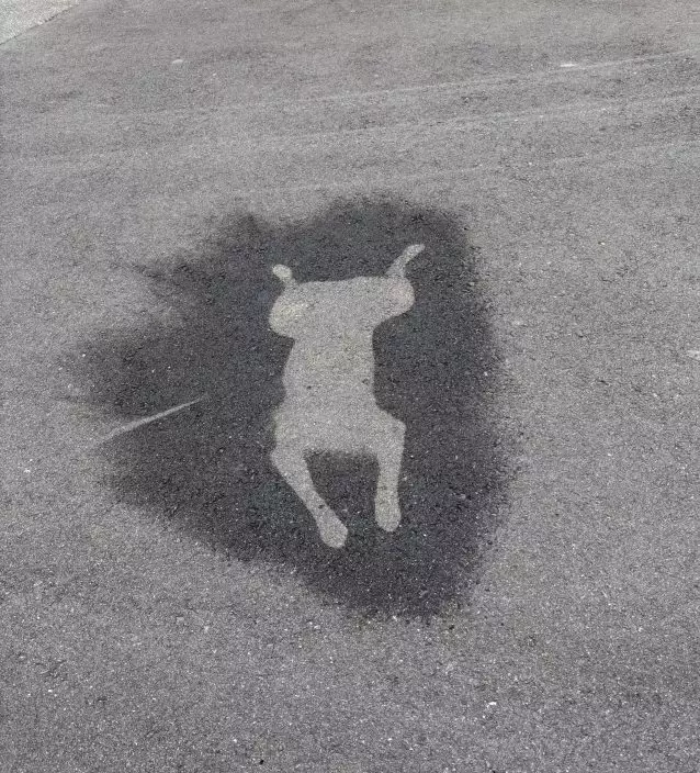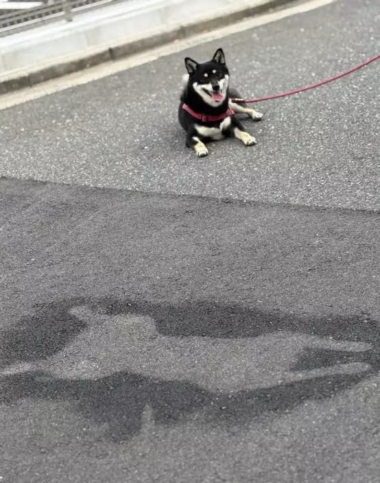當時,小拓正趴在路中央休息,飼主見狀立即拿出噴瓶灑水降溫,小拓對此極為享受。豈料牠起身準備繼續散步時,地面竟留下一個極為清晰的「剪影」。除了四肢輪廓分明外,就連被壓扁的腹部與腰身也清晰可見,形態逼真。事後,小拓滿臉燦笑地坐在飼主身旁,似乎對自己的「傑作」相當滿意,惟「作品」很快便在熱氣中蒸發消失。