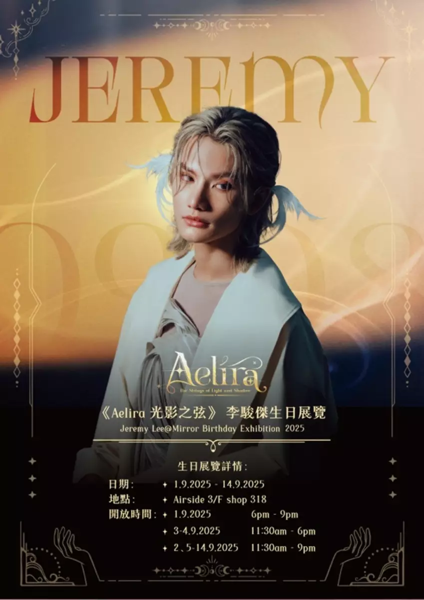 香港歌⼿李駿傑(Jeremy@Mirror)將於9⽉8⽇踏入30歲⽣⽇。為慶祝這⼀重要⾥程碑,並感謝⼀路相伴的Unicorns (粉絲暱稱),其官⽅歌迷會特別籌劃了⼀個為期兩星期的「Aelira - 光影之弦」⽣⽇展覽。展覽將於九龍啟德AIRSIDE隆重舉⾏,透過光影藝術與創意展區,帶領參觀者沉浸於⼀場夢幻旅程,感受Jeremy與Unicorns之間的情感連繫。