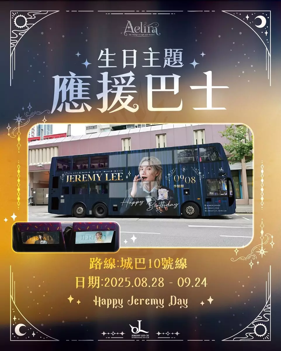 除了⽣⽇展覽,歌迷會更為Jeremy的30歲⽣⽇精⼼打造了⼀輛以Jeremy ⽣⽇派對及光影作為主題的應援巴⼠,更會⾏駛⼀個⽉,並於8⽉28⽇正式啟動!城巴10號巴⼠⾏駛路線涵蓋北⾓碼頭⾄堅尼地城,途經炮台⼭、銅鑼灣、灣仔、⾦鐘、中環、上環、西營盤及⽯塘咀。⾞廂內外均以Jeremy為主題設計裝飾,並展⽰他特地為歌迷會拍攝的⽣⽇主題相片,讓Unicorns與乘客在旅途中⼀同感受⽣⽇的喜悅與特別氛圍。