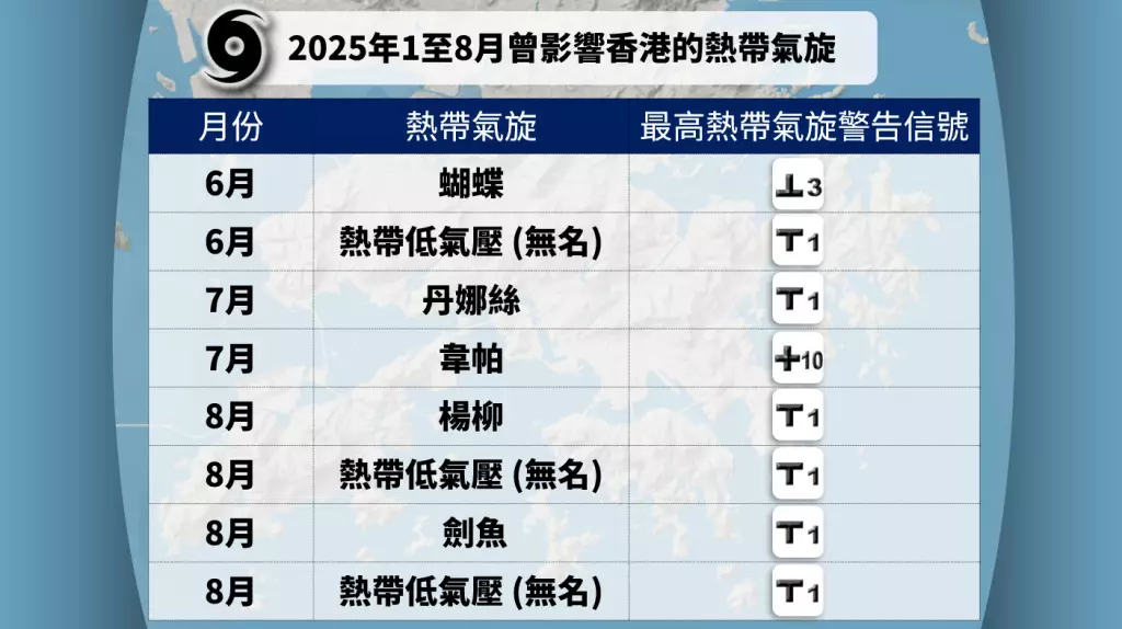 天文台說,今年至今共發出8次熱帶氣旋警告信號,破了1946年以來1至8月的最高紀錄。今年8月共發出4次熱帶氣旋警告信號,平了1946年以來的單月最高紀錄。